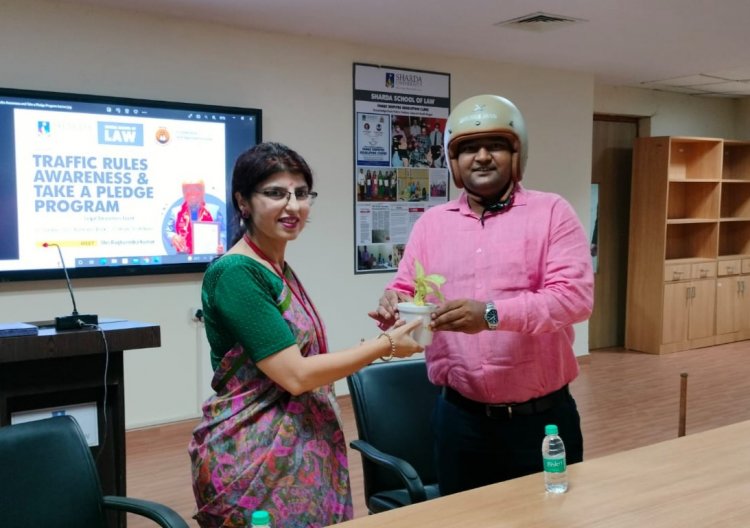 ,शारदा स्कूल ऑफ लॉ प्रोफेसर कोमल विग ने ट्रैफिक संबंधित समस्याओं व विद्यार्थियों का ट्रैफिक नियमों की समझ पर अपने विचार रखे। इस दौरान विश्विद्यालय की सड़कों पर लोगों, विद्यार्थियों को हेलमेट पहनने के लिए मशाल यात्रा निकाल कर जागरूक किया गया।