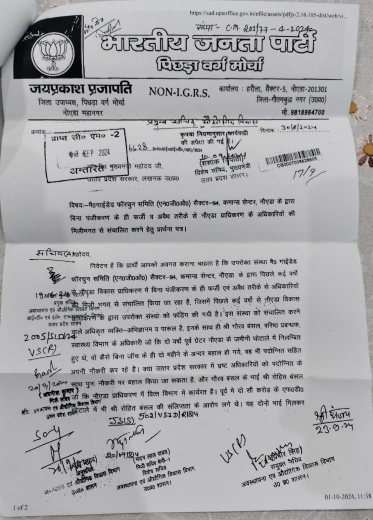 नोएडा। नोएडा प्राधिकरण के जनस्वास्थ्य विभाग के खण्ड-1 के प्रभारी वरिष्ठ प्रबंधक गौरव बंसल के खिलाफ अवैध रूप से फर्जी संगठनों व कबाड़ियों के साथ मिलकर कूड़ा उठाने का आरोप लगा है। भाजपा ओबीसी मोर्चा के उपाध्यक्ष व राष्ट्रीय पिछड़ा वर्ग आयोग के उपाध्यक्ष व दर्जा प्राप्त केन्द्रीय मंत्री डा. लोकेश प्रजापति के नोएडा कैंप कार्यालय प्रभारी जयप्रकाश प्रजापति ने इसकी लिखित शिकायत मुख्यमंत्री, मुख्य सचिव व नोएडा प्राधिकरण के चेयरमैन मनोज कुमार सिंह, औद्योगिक विकास मंत्री नंदगोपाल गुप्ता नंदी तथा नोएडा प्राधिकरण के सीईओ डा. लोकेश एम से की है।