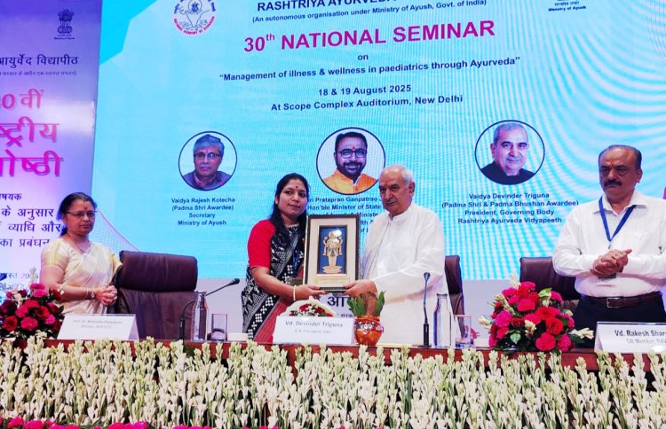 नई दिल्ली: पंजाबी बाग स्थित राष्ट्रीय आयुर्वेद विद्यापीठ द्वारा आयोजित 30 में राष्ट्रीय वैज्ञानिक संगोष्ठी,, आयुर्वेद के अनुसार बाल रोग में व्याधि और स्वास्थ्य प्रबंधन,, के उद्घाटन अवसर पर सीजीओ कांप्लेक्स स्थित स्कोप सभागार में राष्ट्रीय आयुर्वेद विद्यापीठ के।शासी निकाय के अध्यक्ष पद्म विभूषित वैद्य देवेंद्र त्रिगुणा ने अपने उद्बोधन में कहा कि हमारे लोकप्रिय यशस्वी प्रधानमंत्री श्री नरेंद्र मोदी जी के नेतृत्व में तथा आयुष राज्य मंत्री प्रताप राव गणपति राव जाधव के दिशा निर्देशन में साथ ही आयु सचिव राजेश कुटेचा के अथक परिश्रम से आज आयुर्वेद निरंतर प्रगति तथा उन्नयन विकास की ओर अग्रसर है जिसमें विश्व के पटेल पर योग और आयुर्वेद की भूमिका निरोग समाज की निर्माण की दिशा में महत्वपूर्ण है।